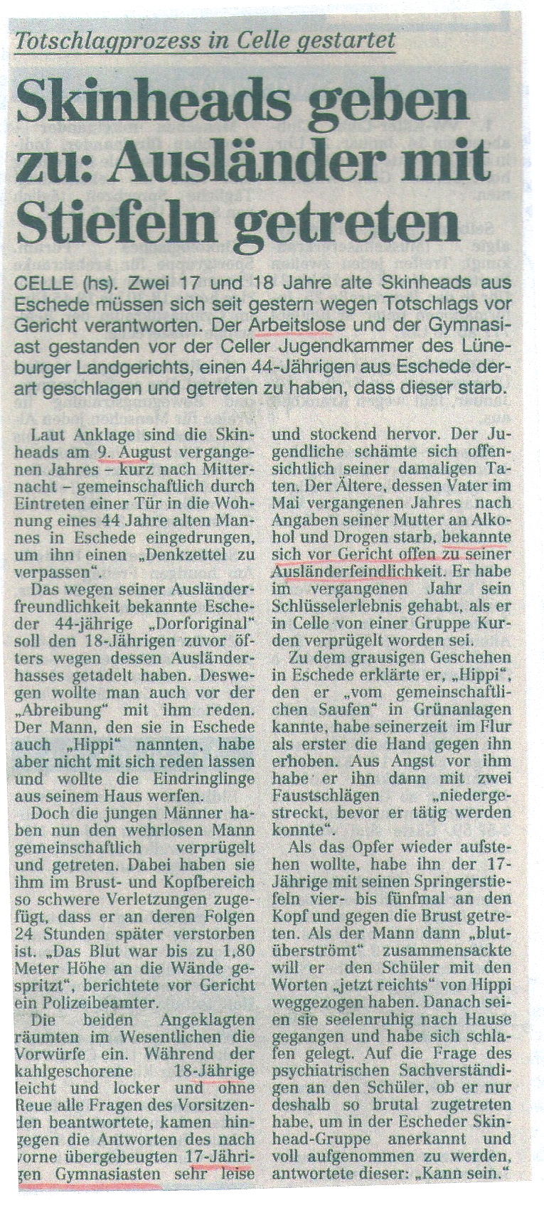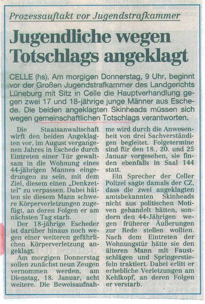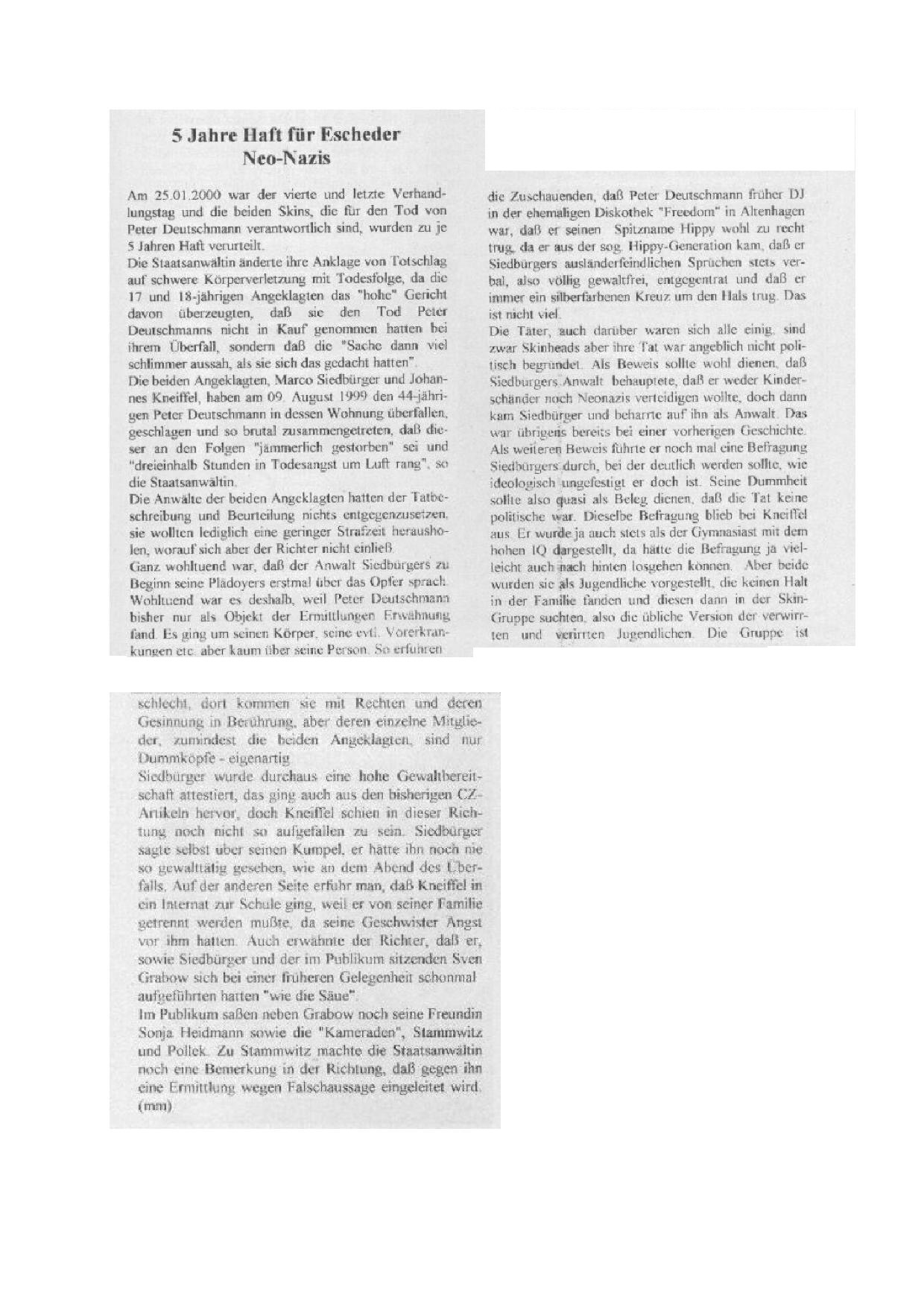 Antwort vom 01.02.2000 auf Anfrage der PDS an Deutschen Bundetstag zum Thema Tötungsdelikte mit fremdenfeindlicher und/oder rechtsextremistischer Motivation