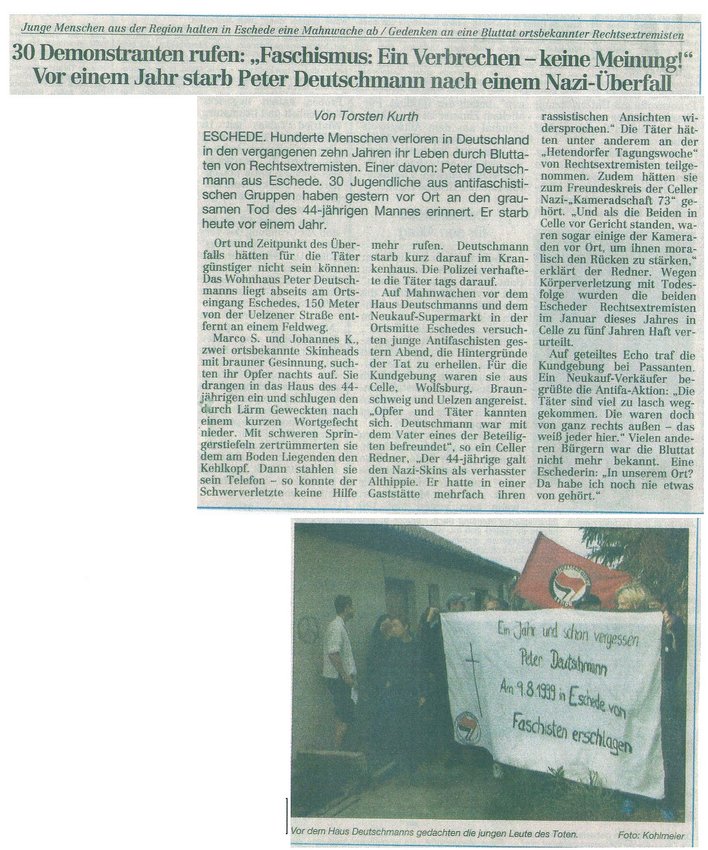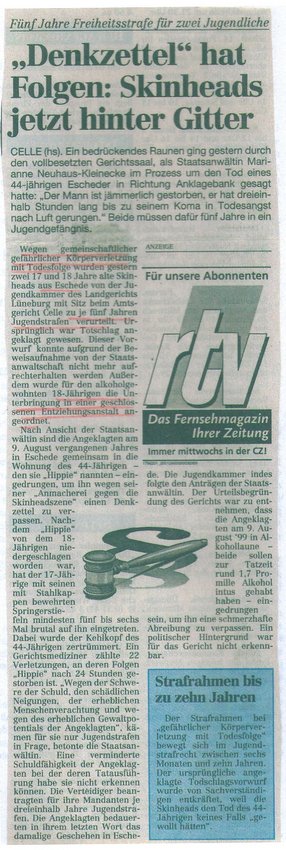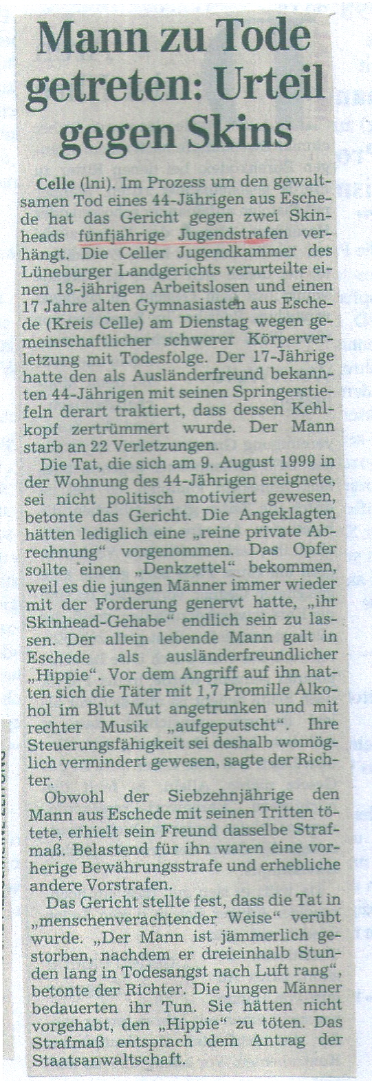 Antwort vom 01.02.2000 auf Anfrage der PDS an Deutschen Bundetstag zum Thema Tötungsdelikte mit fremdenfeindlicher und/oder rechtsextremistischer Motivation